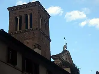 O campanário quadrado românico está situado na parte traseira esquerda da igreja. Sua construção iniciou-se em 1196, durante o pontificado de Celestino III. É provável que a parte superior seja do final do século XII e a base, um pouco mais antiga, provavelmente do final do século XI.