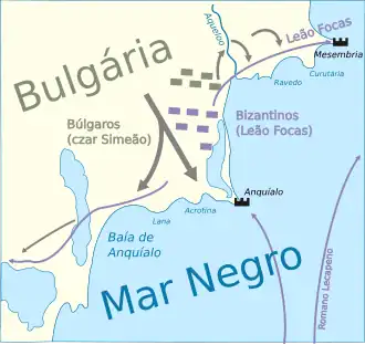 O exército bizantino marchou para o norte e acampou nas proximidades da poderosa fortaleza de Anquíalo. Leão Focas pretendia invadir a Mésia e se encontrar com os pechenegues e as tropas de Lecapeno em Dobrudzha. Simão rapidamente concentrou suas tropas nas elevações à volta da fortaleza.