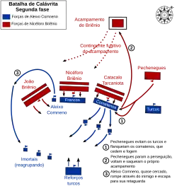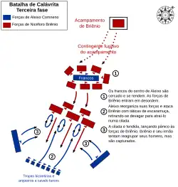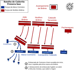 Tendo restaurado a ordem às forças sobreviventes, e consciente da confusão nas forças de Briênio, Aleixo decidiu contra-atacar. O plano que dispôs fez maior uso das habilidades particulares de seus arqueiros turcos a cavalo. Ele dividiu sua força em três comandos, dos quais dois foram deixados atrás em emboscada. O outro, formado pelos imortais e comatenos sob Aleixo, não foi disposto em uma linha contínua, mas quebrado em pequenos grupos, entremeados com outros grupos de arqueiros a cavalo. Este comando avançou sobre os rebeldes, atacou-os e então fingiu retirar-se e atraiu-os para a emboscada.[26][28]