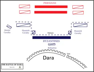 Apesar de ficar superado em número, Belisário decidiu atacar os persas, que se encontravam fracamente armados. Escavou uma série de valetas na estrada para Dara para bloquear a cavalaria persa, e organizou a maior parte da sua infantaria num único bloco. Nos flancos, situou a cavalaria composta pelos hérulos sob o comando de Faras e Buzes. No flanco esquerdo, também enviou 300 hunos a cavalo com Sunicas e Aigã ao comando, mais outros 600 no direito, sob comando de Símas e Ascano. Ficou uma reserva de cavalaria bizantina dirigida pelo general João na retaguarda do flanco direito. Antes da batalha, estas forças permaneceram ocultas atrás das valetas.