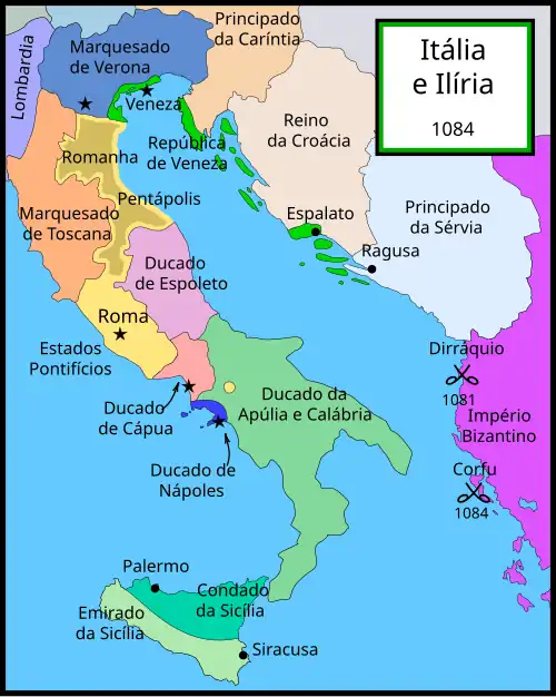 ![]() Mapa mostrando os principais campos de batalha da campanha de Roberto Guiscardo contra o Império Bizantino. | |||
