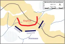 A batalha de Hastings foi travada em 14 de outubro de 1066 entre o exército franco-normando do duque Guilherme II da Normandia (r. 1035–1087) e um exército inglês sob o rei anglo-saxão Haroldo II (r. 1066), durante a conquista normanda da Inglaterra. Ocorreu cerca de 11 quilômetros a noroeste de Hastings, perto da atual cidade de Battle, em East Sussex, e teve como resultado uma decisiva vitória normanda.
