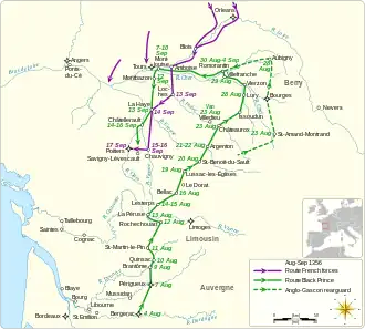 Uma força combinada de seis mil gascões e ingleses deixaram Bergerac em 4 de agosto de 1356 em direção ao norte. Juntos estavam aproximadamente quatro mil não combatentes.[60][61] Todos os combatentes estavam montados, incluindo aqueles que sempre lutariam em pé, como os arqueiros. O exército anglo-gascão se separou em 14 de agosto em três divisões que continuaram a marchar para o norte uma ao lado da outra, sistematicamente devastando por onde passavam. As unidades dos flancos estavam a 64 quilômetros uma da outra, permitindo que devastassem uma faixa de oitenta quilômetros de largura, mas ainda assim capazes de enfrentarem um inimigo dentro de um dia. Avançaram lentamente para facilitar suas tarefas de saque e destruição.[62][63] O historiador David Green descreveu o progresso do exército de Eduardo como "deliberadamente destrutivo, extremamente brutal ... metódico e sofisticado".[64] Vários castelos foram atacados e capturados.[65] A população em sua maior parte fugiu ou se rendeu assim que as tropas anglo-gascãs eram avistadas. Houve novamente pouca resistência. Caso um exército de campo francês estivesse na área, as forças anglo-gascãs só precisariam ficar relativamente próximas umas das outras, prontas para darem apoio caso uma fosse atacada. A ausência de qualquer força do tipo permitiu que as formações do príncipe se dispersassem bastante a fim de maximizar seu efeito destrutivo pelo interior francês.[66]