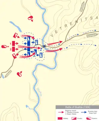 Quando Teodoro foi coroado imperador da Bulgária em 1300, ele buscou se vingar pelos constantes ataques tártaros dos últimos vinte anos. Os traidores foram punidos primeiro, incluindo o patriarca Joaquim III da Bulgária, que foi considerado culpado de ajudar os inimigos da coroa. Então, tsar se voltou para os bizantinos, que haviam incitado os tártaros para poder conquistar as principais fortalezas da Trácia. Em 1303, o exército búlgaro marchou para o sul e reconquistou diversas cidades. No ano seguinte, o exército bizantino enviado para contra-atacar encontrou as forças búlgaras perto do rio Skafida.