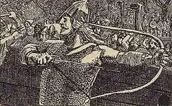 Einar pegou o arco, e o esticou além da ponta da flecha. "Muito fraco, muito fraco", ele disse, "para o arco de um poderoso rei!" e, deixando o arco de lado, retirou sua espada e escudo, e lutou corajosamente.[44]