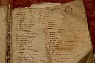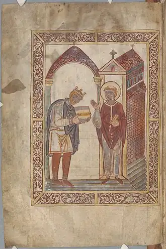 - [k] ^ Beda ficou conhecido como "Venerável Beda" (em latim: Beda Venerabilis) já no século IX,[133] mas o epíteto não estava ligado ao fato de ele ser considerado para uma eventual canonização pela Igreja Católica (vide venerável). De acordo com a lenda, o epíteto foi dado milagrosamente por anjos para completar seu epitáfio, que estava incompleto.[134] Ele foi utilizado pela primeira vez no século IX, quando Beda foi incluído num grupo de outras pessoas chamadas de "veneráveis" em dois concílios realizados em Aquisgrano (ou Aachen ou Aix-la-Chapelle, a capital do Império Carolíngio) em 816 e 836. Paulo, o Diácono, passou então a só chamá-lo de "venerável", um costume que, no século XI e XII, já era regra. É fato, porém, que não existem relatos de Beda sendo chamado assim perto da época de sua morte.[5]
