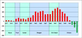 Durante sua presidência, Bill Clinton apresentou uma variedade de novas leis e regulamentações, aprovadas no Congresso ou implementadas por ordens executivas. Algumas destas políticas, como o Tratado Norte-Americano de Livre Comércio e reformas no sistema de assistencialismo social, são atribuídas a sua filosofia de governo centrista da chamada "Terceira via", enquanto em outros assuntos era considerado de centro-esquerda.[70][71] Na política econômica, contudo, era visto como um apoiante do conservadorismo fiscal. Durante seu governo, os Estados Unidos viram uma redução no déficit orçamentário.[72][73] Além disso, Clinton presidiu sobre a maior expansão econômica em tempos de paz na história do país.[7][9][74] O Escritório Orçamentário do Congresso reportou um superávit nas contas públicas de US$ 69 bilhões em 1998, US$ 126 bilhões em 1999 e US$ 236 bilhões em 2000,[75] os três últimos anos da presidência de Bill.[76] Já o déficit orçamentário ficou em US$ 5,413 trilhões em 1997 e US$ 5,656 trilhões em 1999.[77] Após deixar a presidência, Clinton se mudou para Nova Iorque e ajudou sua esposa a ganhar o posto de Senadora por lá.
