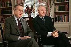 Clinton acabou vencendo a eleição presidencial americana de 1992 (com 43% da preferência do eleitorado, ou 44 909 806 votos) em cima do presidente republicano George H. W. Bush (que conseguiu 37,4% dos votos). O bilionário populista Ross Perot, que concorreu como independente, acabou sendo um fator desequilibrador nas eleições, roubando muitos votos de Bush (ele conseguiu 18,9% dos votos totais). Para os analistas, o fator determinante na derrota do presidente incumbente e na eleição de Clinton foi a queda da popularidade de Bush após números ruins da economia.[67] A eleição do democrata Bill Clinton pôs fim a doze anos de governo republicano na Casa Branca. Os democratas também conquistaram a maioria no Congresso dos Estados Unidos,[1] sendo esta a primeira vez desde os anos 1970 que o partido tinha o controle dos poderes legislativo e executivo ao mesmo tempo.[68][69]
