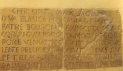 "Consagrada a Cristo Sumo Benfeitor e Todopoderoso Nosso Senhor, Dona Branca Rainha das Espanhas, filha de Bourbon, descendente da ínclita linhagem dos reis de França, foi grandemente formosa de corpo e costumes, mas prevalecendo a manceba, foi morta a mando do rei D. Pedro I o Cruel seu marido. Ano da Saúde de 1361. Sendo ela de 25 anos de idade."