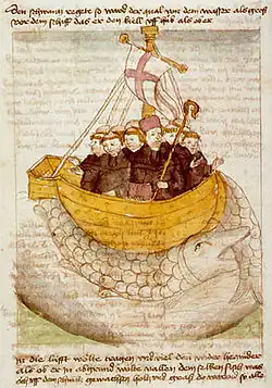São Brandão sobre a baleia, num manuscrito do século XV