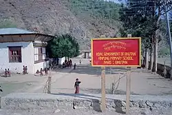O Ministério da Educação do Butão é o órgão responsável pela administração, coordenação e supervisão do sistema de educação do reino, consistindo numa estrutura organizacional centralizada. A educação formal é composta por níveis de educação pré-escolar, secundário e ensino superior, que é assumido em parte pelo Estado. Historicamente, a educação no Butão era monástica, com a educação escolar secular para a população em geral introduzida na década de 1960. A paisagem montanhosa representa barreiras para serviços educacionais integrados.[23]
