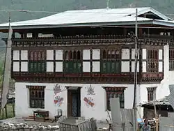 Uma típica casa butanesa em Paro. As fachadas multicoloridas de madeira, as pequenas janelas em arco e o telhado inclinado são características da arquitetura do reino.