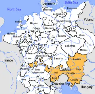 | Ducado | Estabelecido em 976 pelo imperador Otto II, realizada pela Arquiduquesa da Áustria desde 1457, parte da Áustria interior de 1564–1619. | |