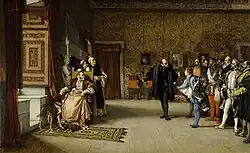 O emprisionado Francisco I da França assinando o tratado com Carlos V após sua captura na batalha de Pavia