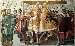 Papa Clemente VII e Imperador Carlos V a cavalo sob um dossel, por Jacopo Ligozzi, c. 1580. Descreve a entrada do papa e do imperador em Bolonha em 1530, quando o último foi coroado como Sacro Imperador Romano pelo primeiro.