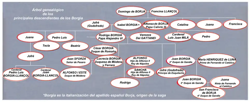 Os membros da família se tornaram proeminentes nos assuntos eclesiásticos e políticos nos séculos XV e XVI, produzindo três papas, Alfonso de Borja, que governou como Papa Calisto III, durante os anos 1455-1458, Rodrigo Lanzol Borgia, como Papa Alexandre VI, durante os anos 1492-1503, e Giovanni Battista Pamphilj (descendente de Rodrigo Bórgia), que governou como Papa Inocêncio X, durante os anos 1644-1655. Especialmente durante o reinado de Alexandre VI, foram acusados de vários crimes, em geral, sobre evidências consideráveis, incluindo nepotismo, adultério, simonia, roubo, estupro, corrupção, incesto e assassinato[1] (especialmente homicídio por envenenamento por arsênico[2]).