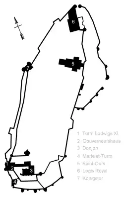 A quatrocentista Casa do Governador está ligada à Torre Luís XI na sua extremidade sul. O grande salão do edifício é agora usado para exposições.