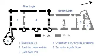 O Logis Royal (Alojamento Real) é constituído por um edifício principal com duas alas de épocas diferentes e pela Torre de Agnès Sorel (Tour Agnès Sorel). A parte mais antiga é formada pela sua ala sul, os chamados Alojamentos Velhos (Vieux Logis), seguida a norte pelo Alojamento Novo (Nouveau Logis), concluído no século XVI. A Torre de Agnès Sorel forma o canto sudeste do edifício e está unida aos Alojamentos Velhos por uma ala baixa de ligação.