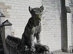 A escadaria que sobe para o portal é delimitada por cães de caça esculpidos em pedra, o que testemunha a função de pavilhão de caça dada ao palácio por Carlos VIII e Luís XII. Acima da entrada encontra-se o brasão da casa real francesa com três flores-de-lis.