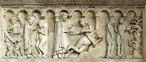 A fachada tem relevos notáveis, obra de Wiligelmo de Módena, um contemporâneo de Lanfranco. Os relevos incluem retratos de profetas e patriarcas e muitas histórias bíblicas, que, em seu conjunto formam uma obra-prima da escultura românica. Os expertos tem escrito muito sobre a maneira em que se apresenta a criação de Adão e Eva, do pecado original e a história de Noé.