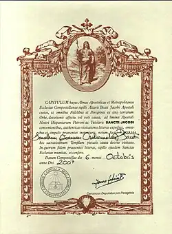 | “ | Pois nos nossos dias revelou-se-nos o prezado tesouro do bem aventurado Apóstolo, ou seja, o seu santíssimo corpo. Ao conhecê-lo, com grande devoção e espírito de súplica, apressei-me a ir adorar e venerar tão precioso tesouro, acompanhado da minha corte, e rendemos-lhe culto no meio de lágrimas e orações como Patrono e Senhor de Espanha, e pela nossa própria vontade, outorgámos-lhe o pequeno obséquio antes referido, e mandámos construir uma igreja em sua honra. | ” |