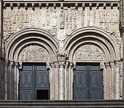 O pórtico é constituído por três arcos de meio ponto que correspondem às três naves da igreja e são suportados por grossos pilares com colunas adossadas. O arco central é maior do que os restantes e o único que tem tímpano; é dividido por uma coluna central, o mainel, com a figura de Santiago. Verticalmente, a parte inferior é formada pelas bases das colunas decoradas com animais fantásticos, a parte média é constituída por colunas que sustentam as estátuas adossadas dos apóstolos e a parte superior pelos arcos que coroam as três portas. O conjunto escultórico é uma representação iconográfica de diferentes símbolos do Apocalipse de São João e de outros textos do Antigo Testamento.[49]