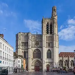 O edifício caracteriza-se sobretudo pela sua solidez, sendo parca nas suas proporções ou elementos de ornamentação. A fachada oeste encontra-se dividida em três portais: o central, onde se destacam as esculturas, que representam a parábola das dez vírgenes e a história de São Estevão; o portal direito, com vinte e duas estatuetas que representam os profetas, sendo ainda pontuado ao centro por uma torre sineira de pedra, decorada com os escudos de armas e as estátuas dos principais benfeitores do templo, culminada por um campanário; e o portal esquerdo, decorado com dois baixos-relevos, que representam a liberalidade e a avareza, bem como com a história de São João Baptista. No campanário, encontram-se conservados dois sinos medievais, apelidados como Savinienne e Potentienne, cujo peso é de 15,3 toneladas e 13,8 toneladas, respectivamente.