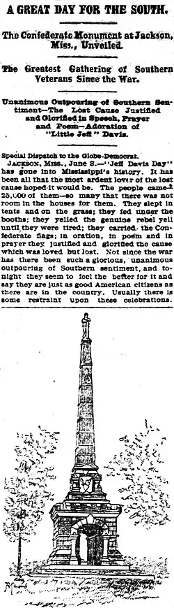 Após a Guerra Civil Americana, os brancos sulistas queriam retratar o Sul de forma positiva, erguendo monumentos confederados para homenagear generais confederados, em apoio à falsa narrativa de que os confederados lutaram na guerra para preservar os direitos dos estados e não a escravidão. Afro-americanos, como o ativista dos direitos civis do século XIX, Frederick Douglass, opuseram-se à construção de memoriais confederados.[33][34]