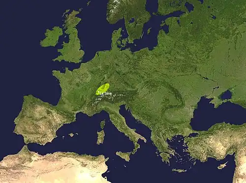 A área verde na imagem sugere a possível extensão da área (proto-)céltica por volta de 1000 a.C. A área laranja indica a região de nascimento da cultura de La Tène e a área vermelha indica a possível região sob influência céltica por volta de 400 a.C. Vestígios associados à cultura celta remontam a pelo menos 800 a.C., no Sul da Alemanha e no Oeste dos Alpes. Todavia, é muito provável que o grupo étnico celta já estivesse presente na Europa Central há centenas ou milhares de anos antes desse período.