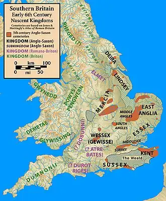 A história do período sub-romano na Britânia é parcamente referida e está sujeita importantes desacordos entre historiadores. Ao que parece, contudo, os raides do século V na Britânia por povos continentais transformaram-se em migrações. Os recém-chegados eram anglos, saxões, jutos e frísios. Capturaram territórios no leste e sul da Britânia, mas perto do fim do século V, uma vitória britânica na Batalha do Monte Badonico parou o avanço anglo-saxão por 50 anos.[1][2] Perto do ano 550, contudo, os britanos voltaram a perder terreno, e dentro de 25 anos, parece que quase todo o sul da ilha estava sob os invasores.[3]