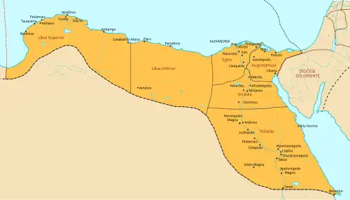 ![]() A província da Líbia Superior, na antiga região da Cirenaica, num mapa da Diocese do Egito, c. 400 | |||||||||
