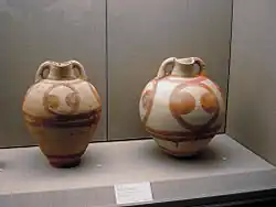 Durante a Idade do Bronze Médio há o desenvolvimento da decoração pintada com o uso de marrom escuro ou vermelho polido sobre uma superfície branca ou de cor clara e suas principais formas são jarras simples ou de bico, jarra com forma de aves e pitos que foram decorados com motivos curvilíneos abstratos ou motivos florais. Além disso, surge nesse período a cerâmica conhecida como cerâmica pintada-matt, uma variante da cerâmica mínea: cerâmica de padrões retilíneos aplicados em preto fosco ou lilás sob uma superfície branca porosa.[81] A mudança mais significativa das composições da Idade do Bronze Tardia é a utilização de motivos decorativos com animais (aves, golfinhos), vegetais (juncos, palmeiras, lírios, açafrão) e figuras humanas.[76]