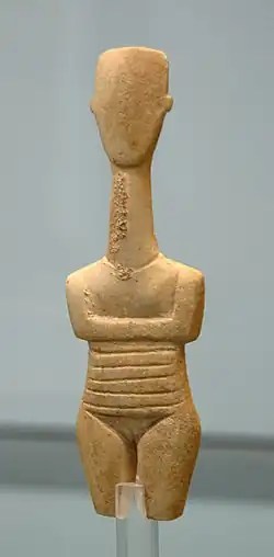 As mais características figurinhas (ou ídolos) foram as figurinhas planas, em sua maioria do sexo feminino (às vezes grávidas), de obsidiana e mármore branco esculpido, que muitas vezes recebiam pigmentos[84] produzidos com materiais locais, como a azurita para o azul e o minério de ferro para o vermelho.[62][68] Expressam notável sensibilidade para a forma e implementação do real e do imaginário.[85] Podem ser encontradas desde Portugal até o Delta do Danúbio,[1] e especialmente em todo o Egeu, sugerindo que eram populares entre os habitantes de Creta e do continente.[86] Entre todos os encontrados os mais famosos aparentam ser duas representações (um tocando harpa e o outro tocando flauta) datadas de 2 500 a.C. que são considerados, às vezes, "Os primeiros músicos do Egeu".[87][88]