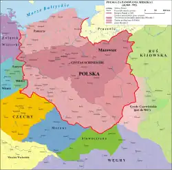 Em 966, Miecislau I, o governante dos polacos, aceitou o cristianismo através dos auspícios da Igreja Romana no Batismo da Polônia. [4] Segundo Gallus Anonymus, foi a primeira esposa de Mieszko, Doubravka, filha de Boleslau I, duque da Boêmia, quem convenceu o marido a se converter ao cristianismo. Além disso, o cronista Dietmar de Merseburgo atribuiu a conversão de Mieszko à influência de Doubravka. O Batismo também teve significado político e provavelmente pretendia aproximar o estado de Mieszko do Ducado da Boêmia e prevenir futuros ataques do Sacro Império Romano em uma tentativa de cristianizar as terras de Mieszko pela força. Posteriormente, o reino de Mieszko foi reconhecido pelo papado e aceito como parte da cristandade. Em 968, foi estabelecido um bispado missionário em Poznań. A regesta intitulada Dagome iudex definiu primeiro as fronteiras geográficas da Polônia com a sua capital em Gniezno e afirmou que o estado estava sob a proteção dos Papas. [5]