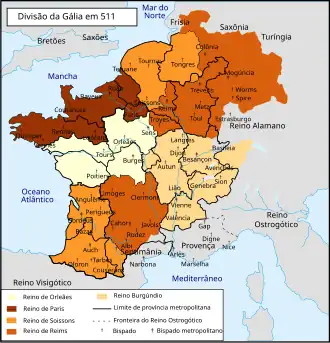 Clóvis I morreu em 511 e está sepultado na Basílica de Saint-Denis, em Paris, enquanto seu pai foi sepultado com os antigos reis merovíngios em Tournai. Com sua morte, seu reino foi dividido entre seus quatro filhos Teodorico, Clodomiro, Quildeberto e Clotário. Isso criou novas unidades políticas dos reinos de Reims, Orleães, Paris e Soissons e inaugurou um período de desunião que durou, com breves interrupções, até o final da dinastia merovíngia em 751.