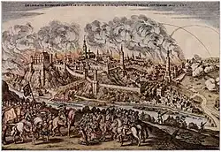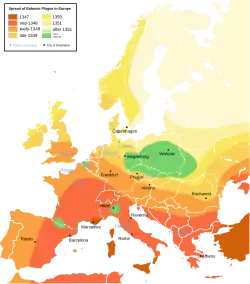 Existem evidências de que as expedições mongóis podem ter espalhado a peste bubónica por grande parte da Eurásia, o que ajudou a desencadear a Peste Negra do início do século XIV.[73][74][75] O historiador italiano Gabriele de' Mussi escreveu que os mongóis catapultaram os cadáveres daqueles que contraíram a peste para Caffa (hoje Feodossia, Crimeia) durante o cerco daquela cidade e que os soldados que foram transportados de lá levaram a peste para os portos do Mediterrâneo. No entanto, este relato da origem da Peste Negra na Europa continua controverso, embora plausível, devido à complexa epidemiologia da praga. Os epidemiologistas modernos não acreditam que a Peste Negra tenha tido uma única fonte de disseminação para a Europa. A investigação sobre o passado sobre este tópico é ainda mais complicada pela política e pela passagem do tempo. É difícil distinguir entre epidemias naturais e guerra biológica, ambas comuns ao longo da história humana. As armas biológicas são económicas porque transformam uma vítima inimiga num sistema de lançamento e, por isso, foram preferidas em conflitos armados do passado. Além disso, até recentemente, morriam mais soldados de doenças do que em combate.[nota 1][76] Em qualquer caso, na década de 1340, a Peste Negra matou 200 milhões de pessoas.[77] A expansão das rotas comerciais no final da Idade Média ajudou a que a peste se espalhasse rapidamente.[78] A população europeia levou mais de dois séculos para regressar ao seu nível anterior à pandemia.[77] Consequentemente, desestabilizou a maior parte da sociedade e provavelmente minou o feudalismo e a autoridade da Igreja.[79]