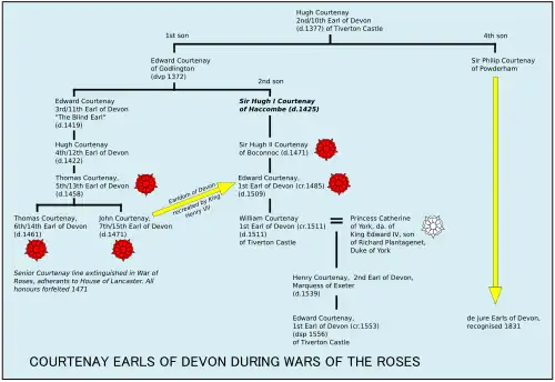 O 1.º/9.º conde foi sucedido por seu filho, Hugh de Courtenay, 2.º/10.º conde de Devon.[20] Três dos oito filhos do 2º/10º conde tiveram descendentes; um quarto, William Courtenay, foi arcebispo de Canterbury e lorde chanceler. Sir Hugh Courtenay (1326–1349), KG, filho mais velho e herdeiro do 2º/10º conde, foi um dos membros fundadores da Ordem da Jarreteira, mas tanto ele quanto seu único filho, Sir Hugh Courtenay (falecido em 1374), faleceram antes do 2º/10º conde.[21] Sir Edward de Courtenay (falecido em 1368/71), o terceiro filho, também faleceu antes de seu pai, mas deixou um filho mais velho, Edward de Courtenay, 3.º Conde de Devon (1357–1419), "O Cego", que herdou como 3º/11º Conde.[22] O filho mais velho do 3º/11º conde, Sir Edward Courtenay (falecido em 1418), casou-se com Eleanor Mortimer, filha de Roger Mortimer, 4.º conde de March, mas faleceu antes de seu pai, sem deixar filhos, e o segundo filho do 3º/11º conde, Hugh de Courtenay, 4.º conde de Devon (falecido em 1422) o sucedeu e se tornou o 4º/12º conde de Devon.[23][24] O 4.º/12.º conde foi sucedido por seu filho, Thomas Courtenay, 5.º/13.º conde de Devon (falecido em 1458).[25]