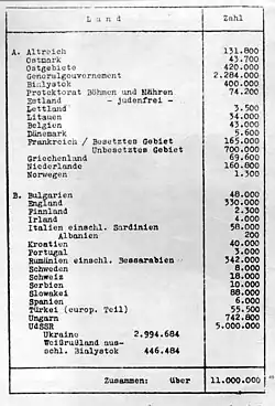 Para a reunião, Eichmann preparou uma lista com o número de judeus existentes em vários países europeus. Os países foram listados em dois grupos, "A" e "B". O grupo "A" continha aqueles sob o controlo ou ocupação directa do Reich (ou parcialmente ocupado e "pacificado", como a França de Vichy); em relação ao grupo "B", eram os países aliados ou Estados-clientes, neutros, ou em guerra com a Alemanha.[42][nota 2] Os números da lista já reflectiam as acções realizadas pelos forças nazis; por exemplo, a Estónia está listada como Judenfrei (livre de judeus), pois os 4 500 judeus que permaneceram naquele país após a ocupação alemã, foram exterminados até ao final de 1941.[43] A Polónia ocupada não se encontrava na lista, pois em 1939 o país foi dividido pelos alemães a oeste, pela União Soviética a leste, e pelo Governo Geral, onde muitos polacos e judeus expulsos já tinham sido colocados.[44]