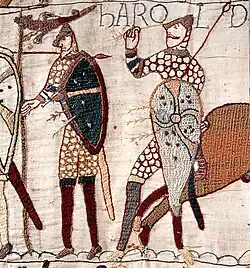 - ↑ Uma tradição do século XII afirmava que o rosto de Haroldo não pôde ser reconhecido e Edite, esposa de direito comum de Haroldo, foi trazida ao campo de batalha para identificar o corpo a partir das marcas que só ela conhecia.[58]
