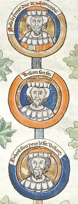 Em 911, o governante franco-carolíngio Carlos, o Simples (r. 898–922) permitiu que um grupo de vikings sob seu líder Rollo se estabelecesse na Normandia, como parte do Tratado de Saint-Clair-sur-Epte. Em troca das terras, esperava-se que os vikings de Rollo fornecessem proteção ao longo da costa contra novos invasores vikings.[1] Sua solução foi bem-sucedida, e os vikings na região tornaram-se conhecidos como os "homens do Norte", da qual "Normandia" e "normandos" são derivados.[2] Os normandos rapidamente adotaram a cultura nativa, renunciando ao paganismo e se convertendo ao cristianismo.[3] Adotaram a língua de oïl de sua nova casa e adicionaram recursos de sua própria língua nórdica, transformando-a na linguagem normanda. Eles se casaram com a população local[4] e usaram o território a eles concedido como base para estender as fronteiras do ducado para o oeste, anexando territórios, incluindo o Bessin, a península do Cotentin e Avranches.[5]