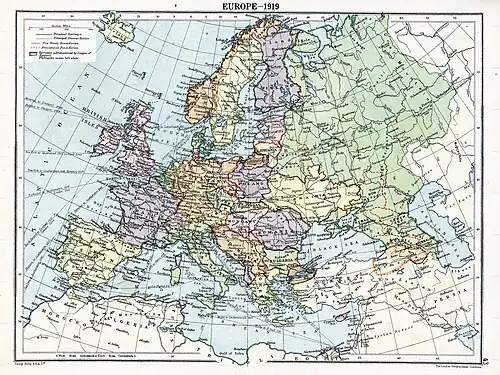 Após 123 anos, a Polônia ressurgiu como um país independente. O Reino da Sérvia e sua dinastia, como uma "nação menor da Entente" e o país com o maior número de vítimas per capita, [13] [14] [15] tornou-se a espinha dorsal de um novo estado multinacional, o Reino dos Sérvios, Croatas e Eslovenos, mais tarde renomeados como Iugoslávia. A Tchecoslováquia, combinando o Reino da Boémia com partes do Reino da Hungria, tornou-se uma nova nação. A Romênia uniria todos os povos de língua romena sob um único estado que conduziria à Grande Romênia. [16] A Rússia tornou-se a União Soviética e perdeu a Finlândia, a Estônia, a Lituânia e a Letônia, que se tornaram países independentes. O Império Otomano foi logo substituído pela Turquia e muitos dos seus territórios tornaram-se mandatos sob domínio britânico ou francês.