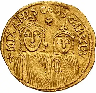 ![]() Constantino (direita) com seu avô Miguel II no reverso de um soldo cunhado durante o reinado de seu pai, Teófilo | |