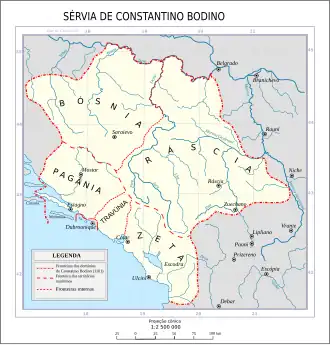 Constantino Bodino tentou manter o intacto reino alargado deixado por seu pai. Para isso, ele realizou uma campanha na Bósnia e na Ráscia, instalando Estêvão como bano na primeira e seus sobrinhos, Marco (Marko) e Bolcano, como zupanos na última. Os dois príncipes eram irmãos de Petrislau, meio-irmão de Constantino, que tinha governado a Ráscia entre 1060 e 1074. Não obstante, após a morte de Roberto Guiscardo em 1085, Constantino teve que enfrentar novamente o Império Bizantino, que recuperou Dirráquio e se preparava para punir o rei da Dóclea por ter tomado partido dos normandos.