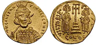 Soldo (moeda)|soldo]] mostrando Constantino e seu irmãos. Moeda cunhada antes de 681 quando os irmãos foram mutilados]]