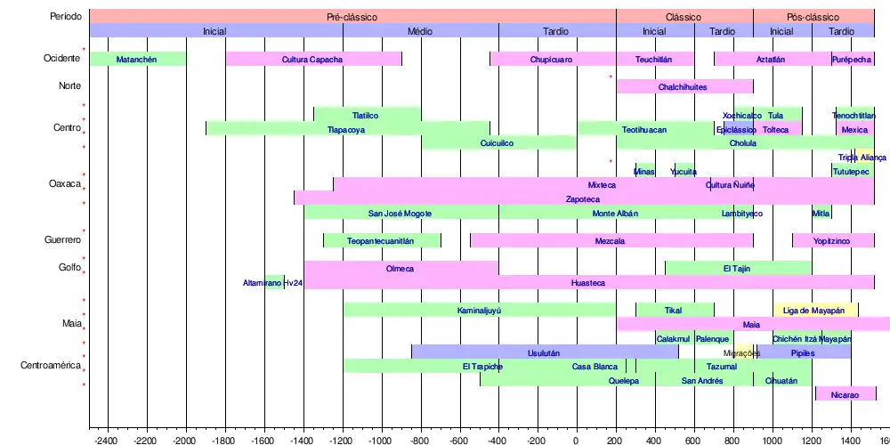 Aparecimento das cidades-estado e da primeira arquitectura cerimonial em grande escala, desenvolvimento das cidades. Desenvolvimento e apogeu da civilização olmeca em locais como La Venta e San Lorenzo Tenochtitlán. Primórdios das culturas zapoteca, de Monte Alto nas terras baixas da costa pacífica da Guatemala e da civilização maia. Importantes centros maias iniciais incluem Nakbé, El Mirador, San Bartolo, Cival e Takalik Abaj.