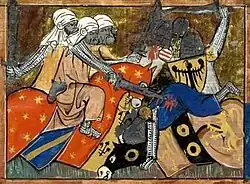 Miniatura do século XIV da Batalha de Dorileia (1147), uma batalha da Segunda Cruzada, do Estoire d'Eracles