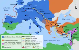 O exército cruzado chegou a Antioquia em 19 de março de 1148 com a intenção de retomar Edessa, mas Balduíno III de Jerusalém e os Cavaleiros Templários tinham outras ideias. O Concílio de Acre foi realizado em 24 de junho de 1148, mudando o objetivo da Segunda Cruzada para Damasco, um antigo aliado do reino que havia transferido sua lealdade para a dos zênguidas. Os cruzados lutaram na Batalha de Bosra com os damascenos no verão de 1147, sem um vencedor claro. A má sorte e as táticas deficientes dos cruzados levaram ao desastroso cerco de cinco dias a Damasco, de 24 a 28 de Julho de 1148.[74] Os barões de Jerusalém retiraram o apoio e os cruzados recuaram diante da chegada de um exército de socorro liderado por Noradine. O moral caiu, a hostilidade aos bizantinos cresceu e a desconfiança se desenvolveu entre os cruzados recém-chegados e aqueles que haviam feito da região seu lar após as primeiras cruzadas. As forças francesas e alemãs sentiram-se traídas uma pela outra, persistindo durante uma geração devido à derrota, à ruína dos reinos cristãos na Terra Santa.[75]