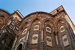 A catedral de Monreale é geralmente descrita como "Normanda-Árabe-Bizantina". As laterais externas das portas principais e seus arcos pontiagudos são magnificamente enriquecidas com incrustações e incrustações coloridas, uma curiosa combinação de três estilos - normando-franceses, bizantinos e árabes.