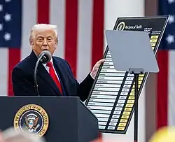 - O Presidente dos Estados Unidos Donald Trump foi eleito em 2024 para um segundo mandato não consecutivo. Ele exibe o gráfico detalhando as tarifas impostas contra os Estados Unidos e suas tarifas retaliatórias do Dia da Libertação, como parte de sua guerra comercial global.