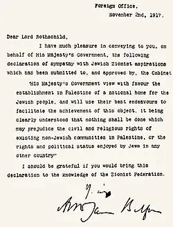 Declaração Balfour é uma carta de 2 de novembro de 1917[1] do então secretário britânico dos Assuntos Estrangeiros, Arthur James Balfour,[1] dirigida ao Lionel Walter Rothschild, Barão Rothschild, líder da comunidade judaica do Reino Unido,[1][2] para ser transmitida à Federação Sionista da Grã-Bretanha. A carta se refere à intenção do governo britânico de facilitar o estabelecimento do Lar Nacional Judeu na Palestina, caso a Inglaterra conseguisse derrotar o Império Otomano, que, até então, dominava aquela região.[3]